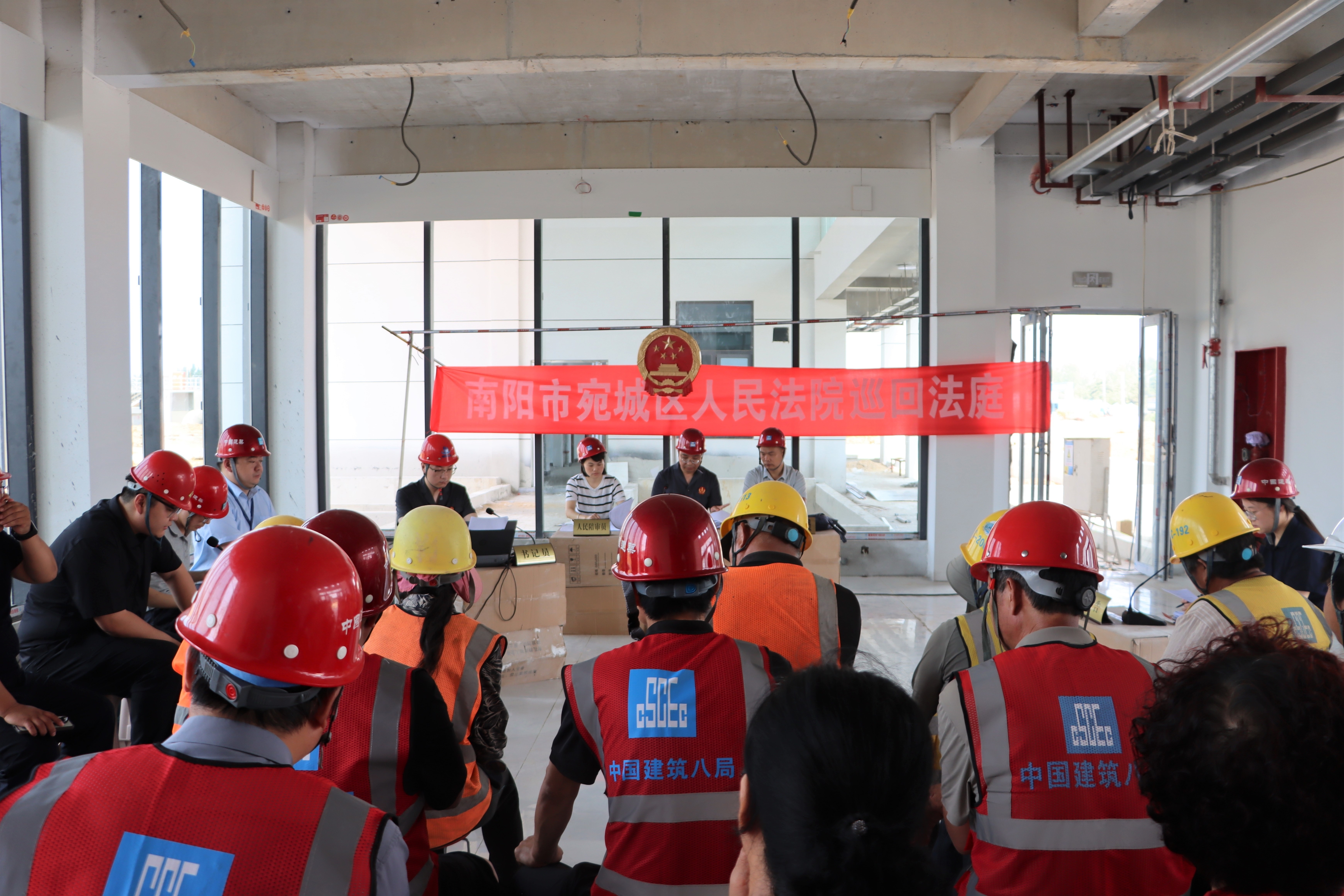 “我这还是头一回在工地看开庭,安全帽和法槌凑在一块儿,新鲜又震撼!”6月17日上午,南阳市宛城区溧河街道清河路某工地,审判长王海燕及两名人民陪审员正认真翻阅案件卷宗,20余名工人坐在旁听席上,大家头戴安全帽,用施工纸箱搭起的审判席上方,庄严的国徽在建筑材料间高悬。这场将审判庭“搬”进工地的司法实践,不仅高效化解了一起提供劳务者受害责任纠纷,更以“行走的法治课”为安全生产筑牢防线。